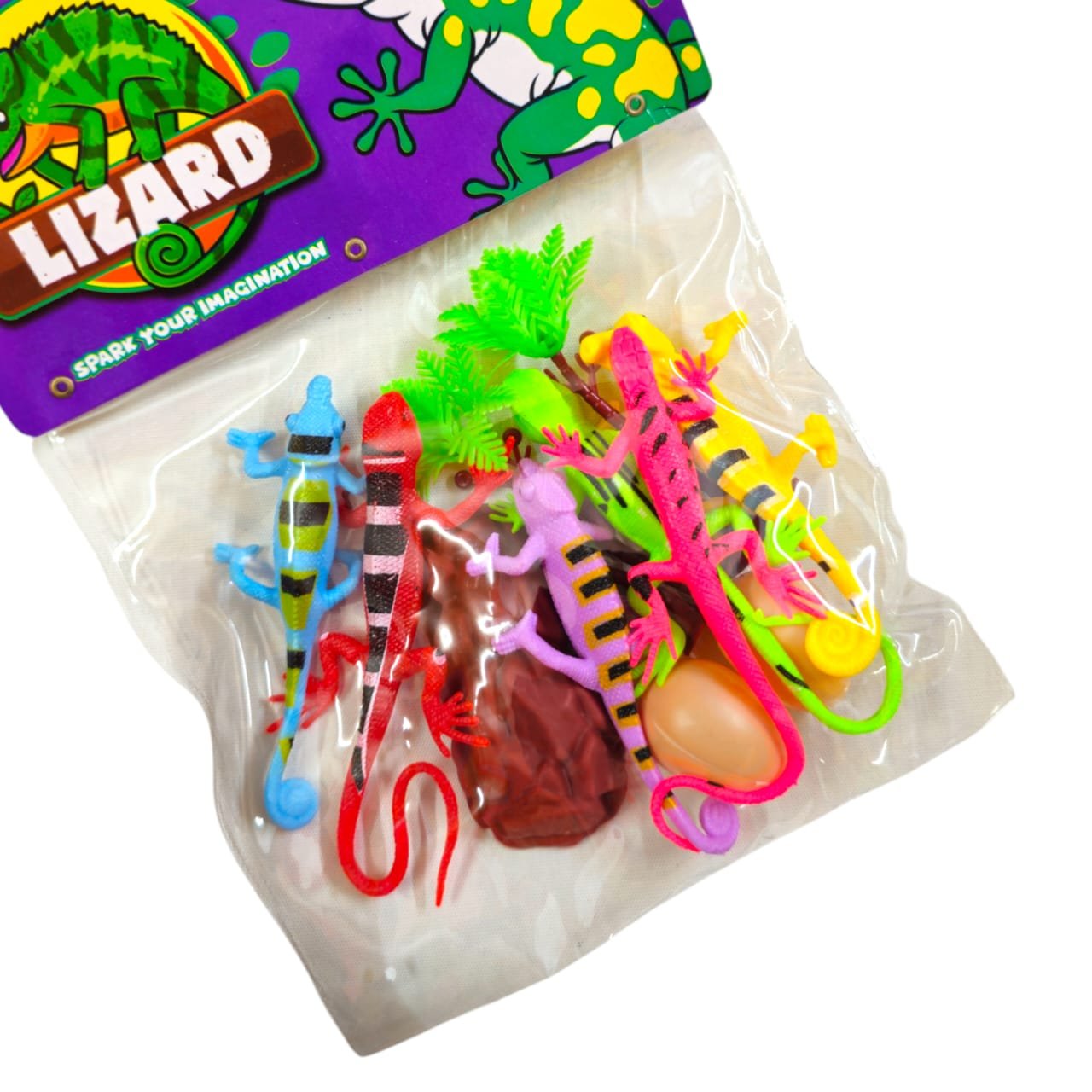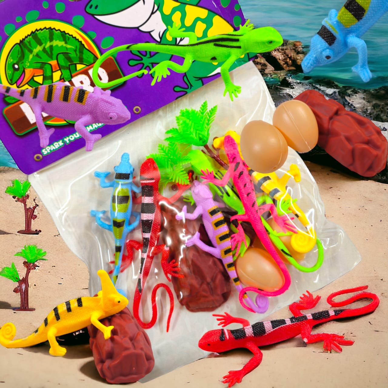 The pack includes 6 colorful lizards, 2 eggs 🥚🥚, and 2 trees 🌳🌳 – perfect for kids to create their own jungle adventure.